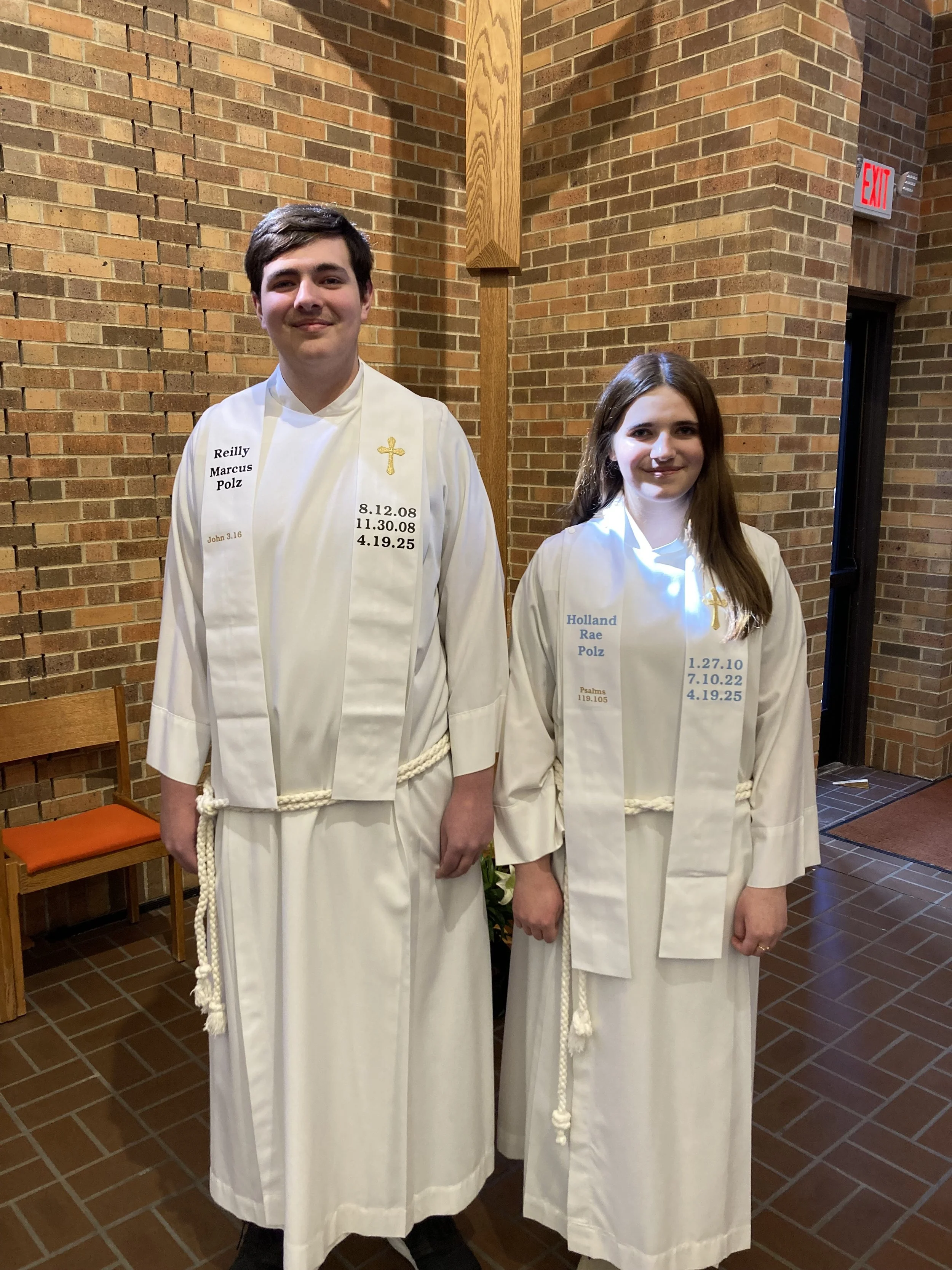Congratulations go out to the two newest confirmed members of Our Savior’s: Holland Polz and Reilly Polz. They are the children of Marcus and Tina Polz, and they affirmed their baptisms at the Vigil of Easter service on the night of Saturday, April 19, 2025. May God bless them and keep them in Holy Baptism their whole lives long.