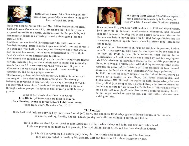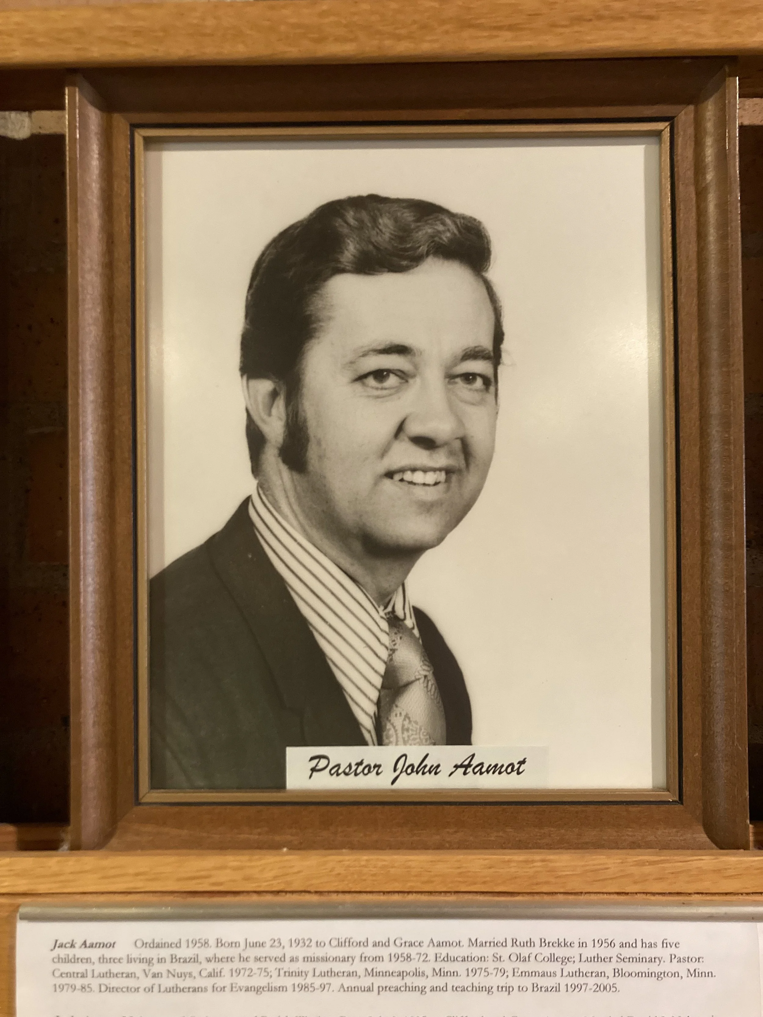 We recently became aware that a son of the congregation, Jack Aamot, and his wife Ruth both died a few months ago. Jack is remembered by a photo in our church’s concourse. He was an ordained Lutheran pastor and a missionary to Brazil.
