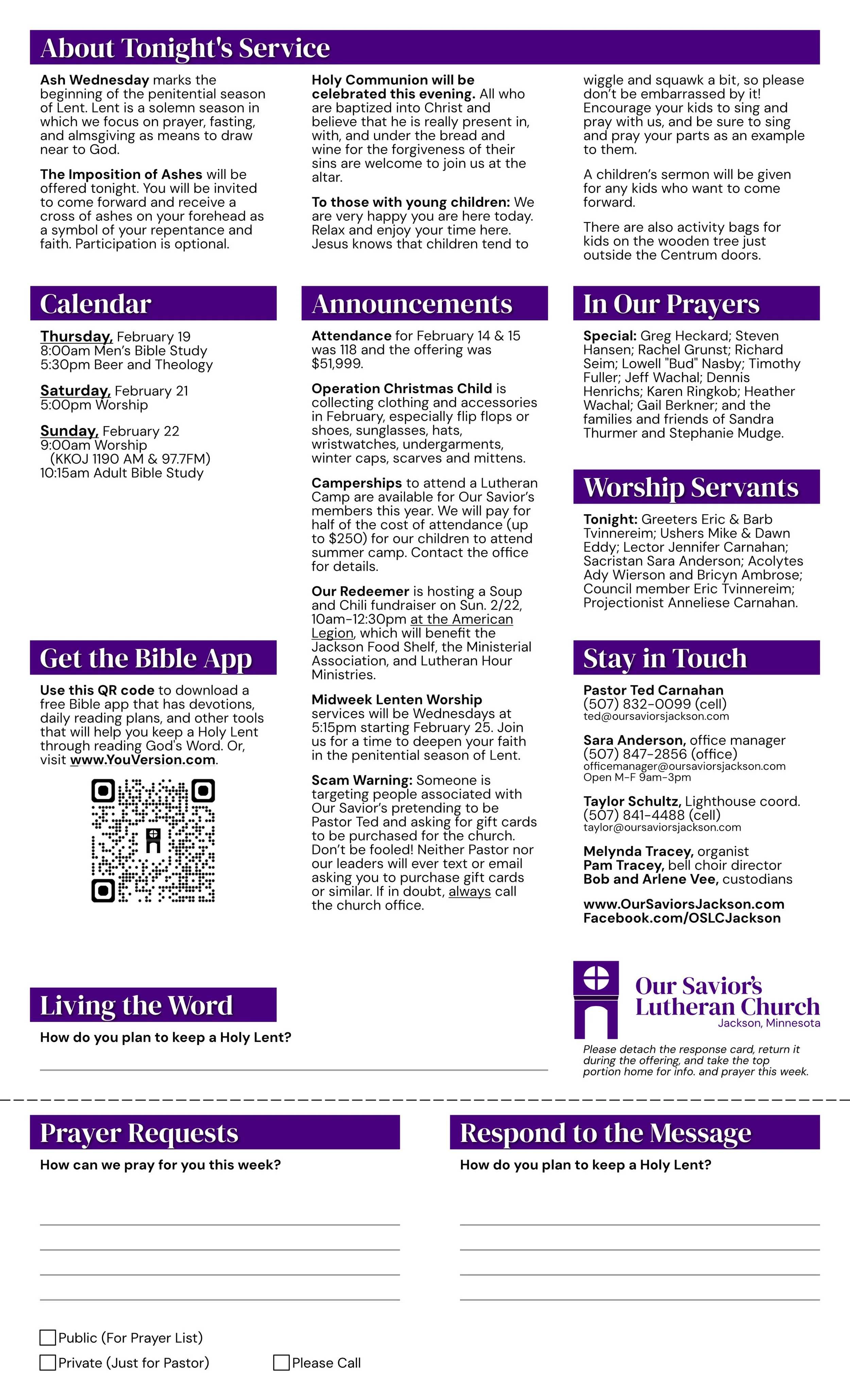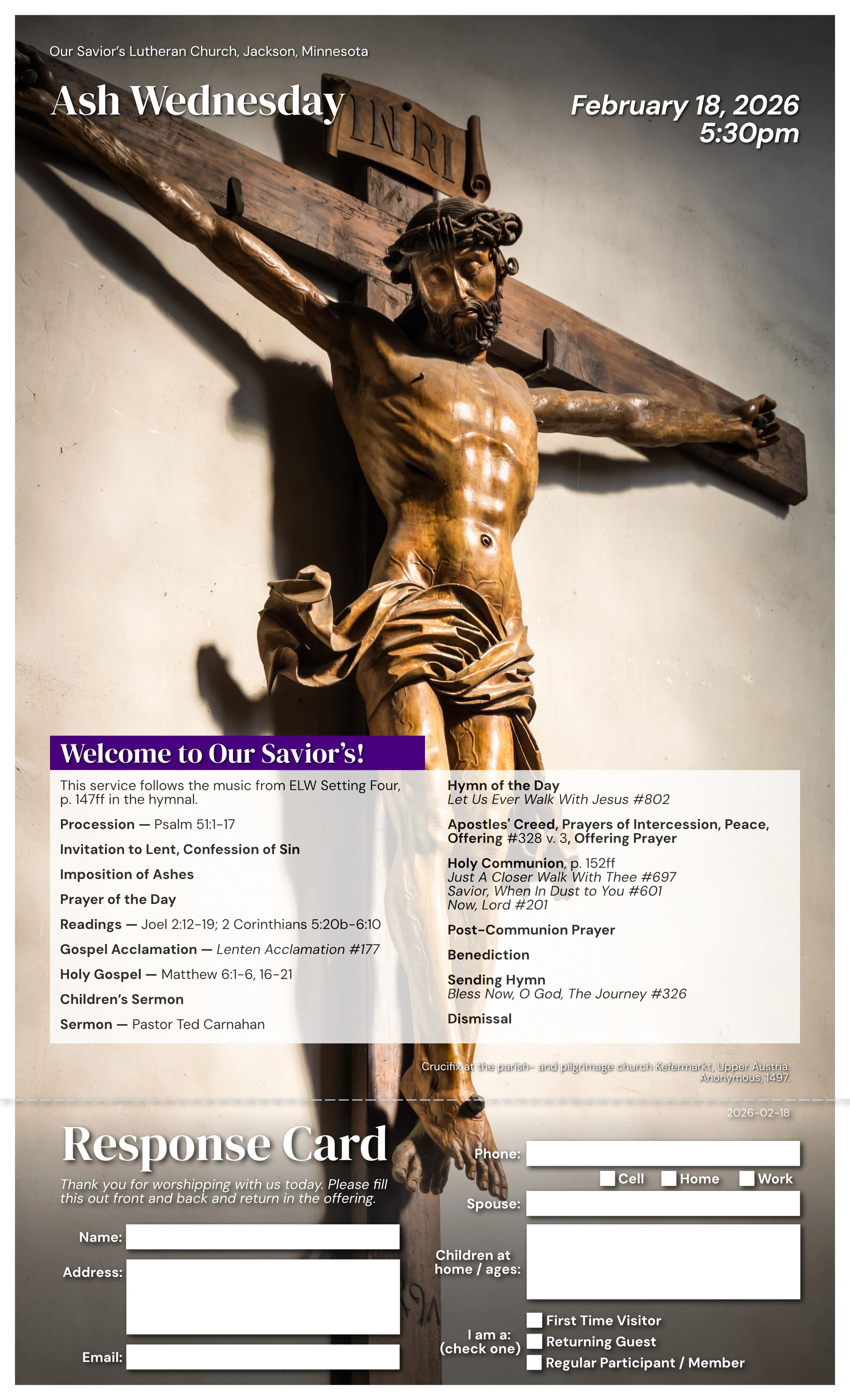 Ash Wednesday Bulletin Bulletin Feb 18 Written By Pastor Ted Carnahan Bulletin for Ash Wednesday, February 18, 2026 at 5:30pm. Pastor Ted Carnahan