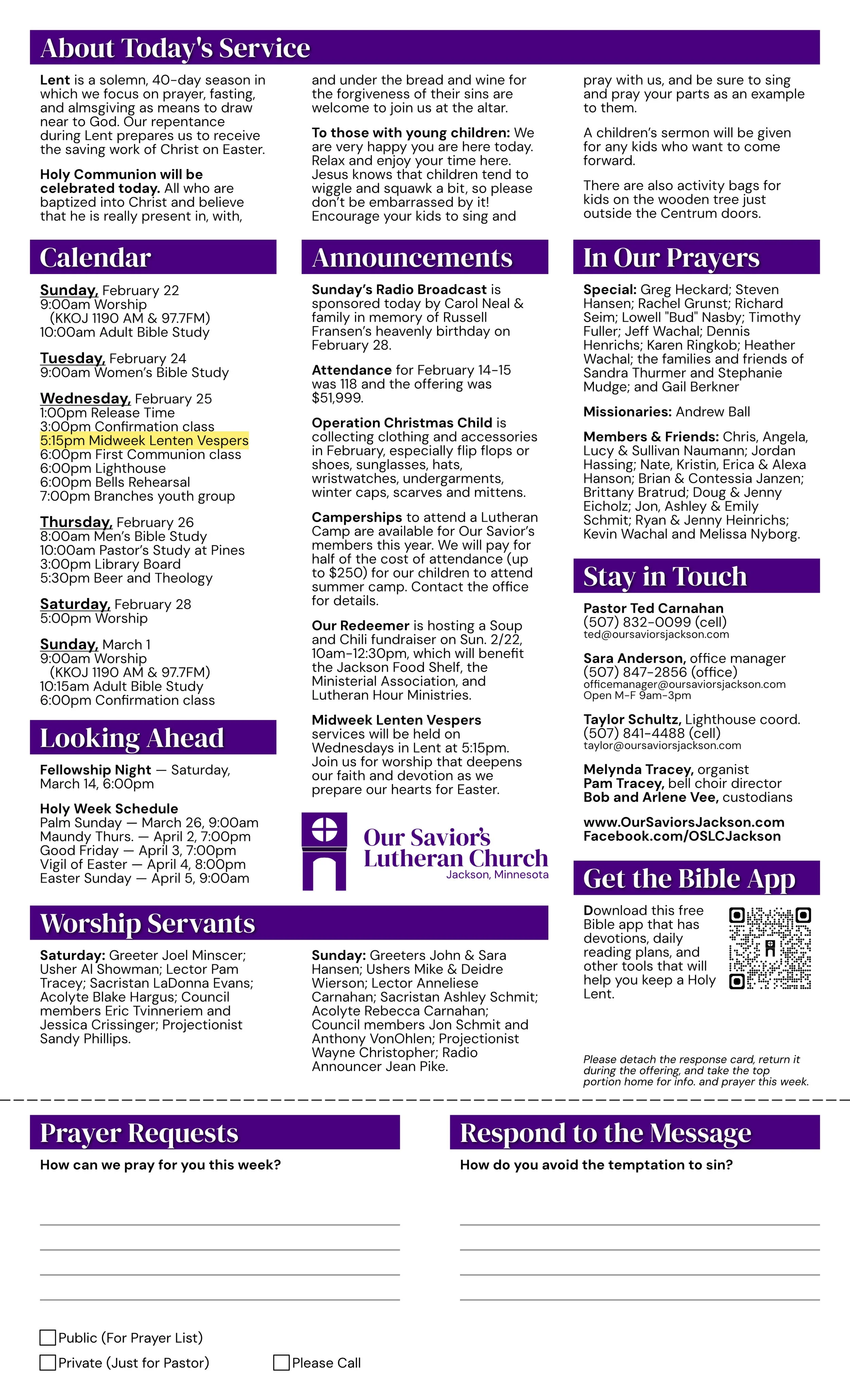 First Sunday in Lent Bulletin Feb 21 Written By Pastor Ted Carnahan Bulletin for the First Sunday in Lent, February 21-22, 2026. Pastor Ted Carnahan