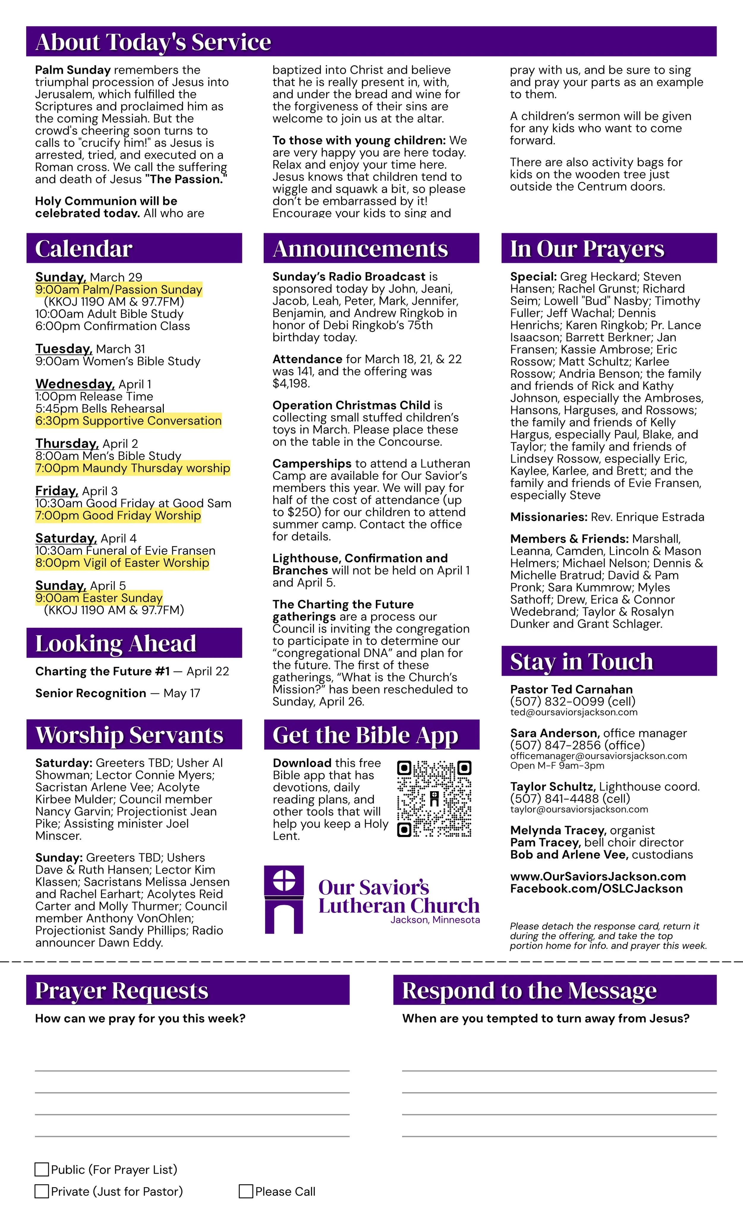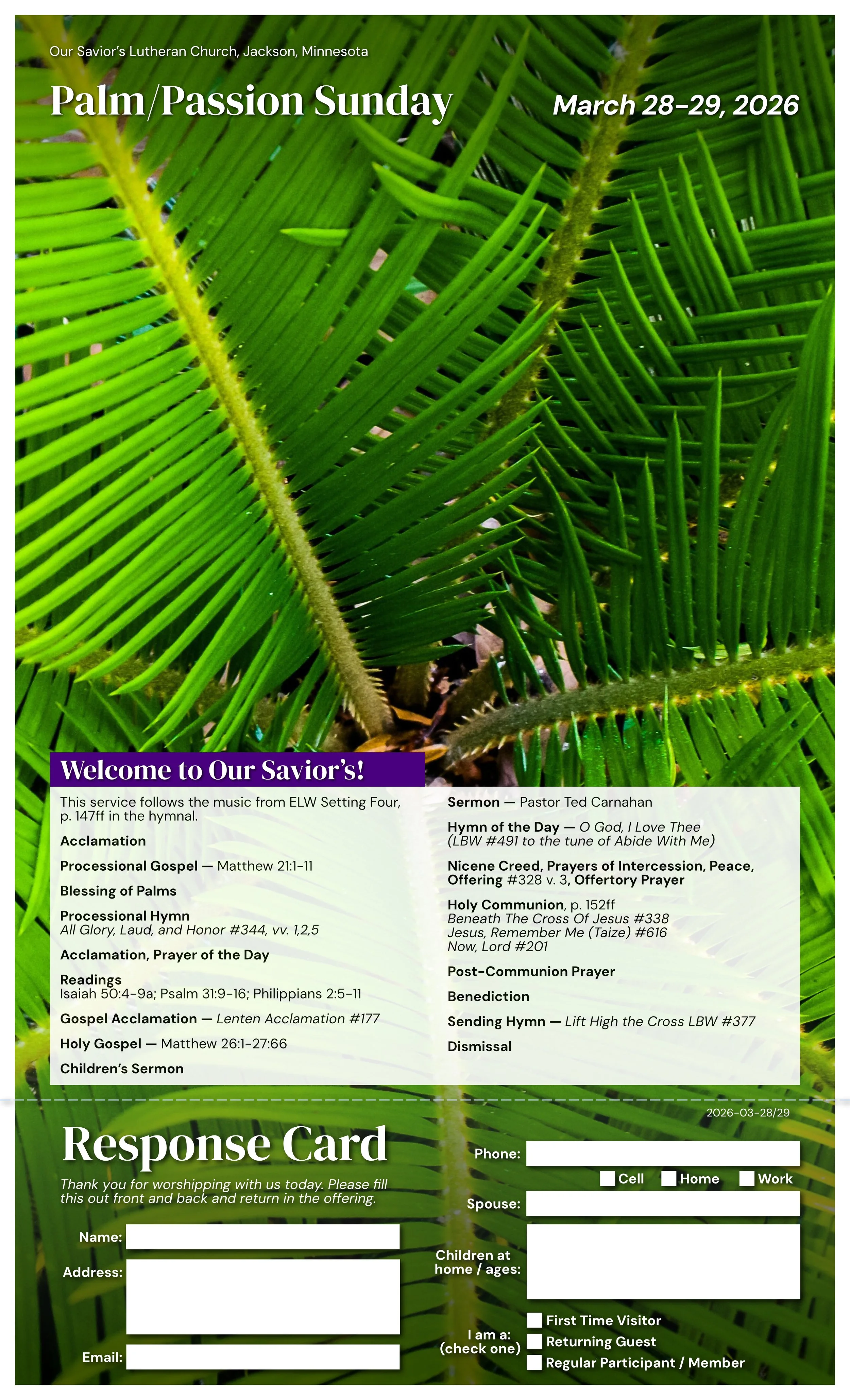 Palm/Passion Sunday Bulletin Mar 28 Written By Pastor Ted Carnahan Bulletin for Palm/Passion Sunday, March 28-29, 2026. Pastor Ted Carnahan