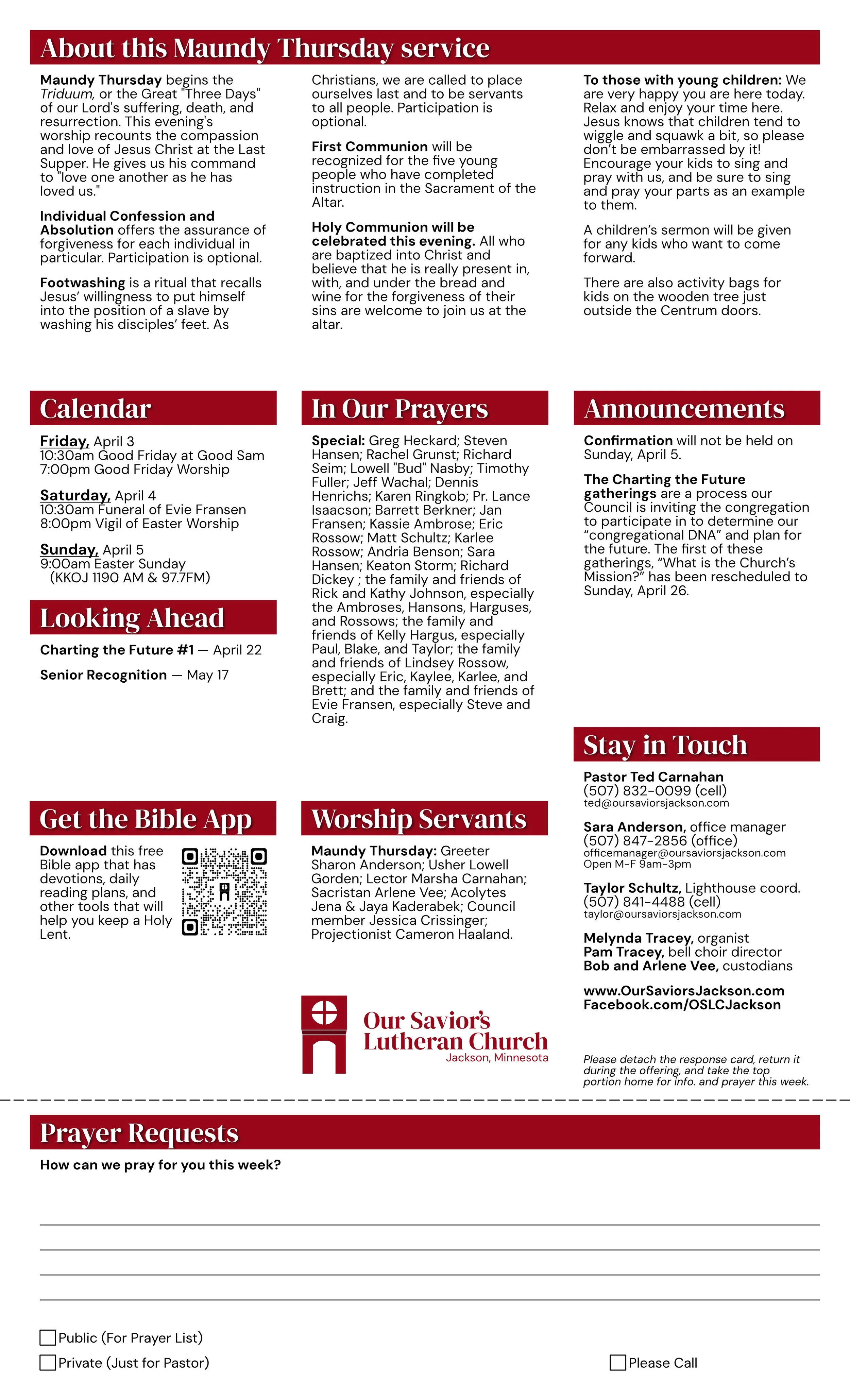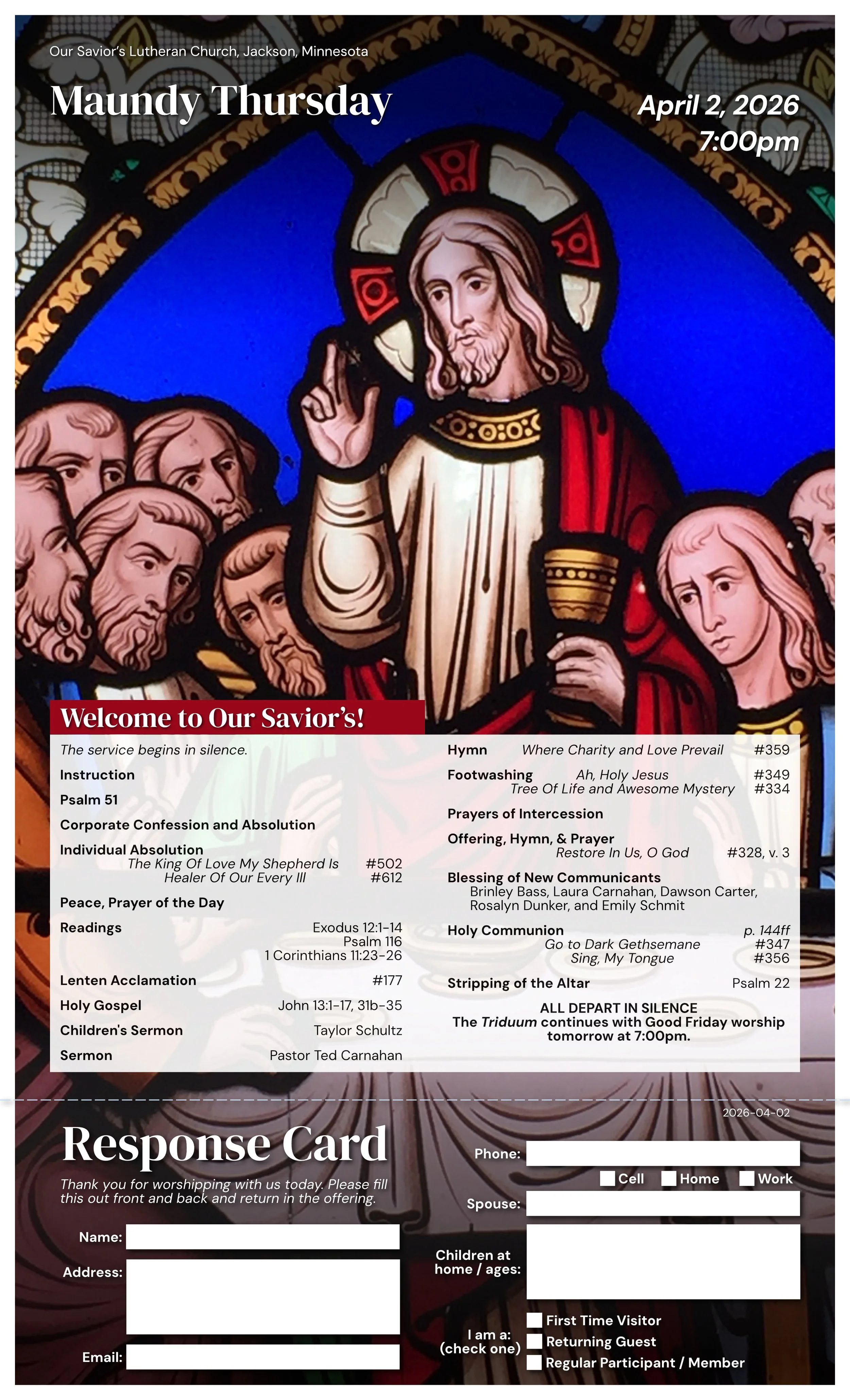 Maundy Thursday 2026 Bulletin Apr 2 Written By Pastor Ted Carnahan Bulletin for Maundy Thursday, April 2, 2026, 7:00pm. Pastor Ted Carnahan